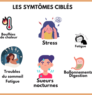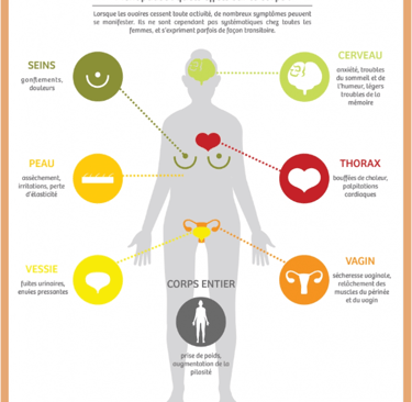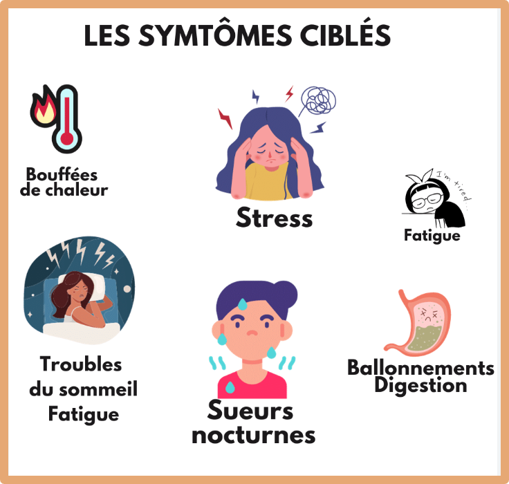 Durant la pré-ménopause, on constate une baisse de la production de progestérone, pouvant être à l’origine d’une prise de poids, de rétentions ou de gonflements des seins. Les taux d’oestrogènes, quant à eux, baissent plus lentement, mais peuvent varier brusquement, causant alors des troubles inconfortables tels que les bouffées de chaleur, les troubles du sommeil, une modification de l’humeur, subis par plus de 50% des femmes. Les bouffées de chaleur sont causées par la stimulation excessive de l’hypothalamus qui commande le fonctionnement des ovaires pour compenser la baisse du taux d’oestrogènes.